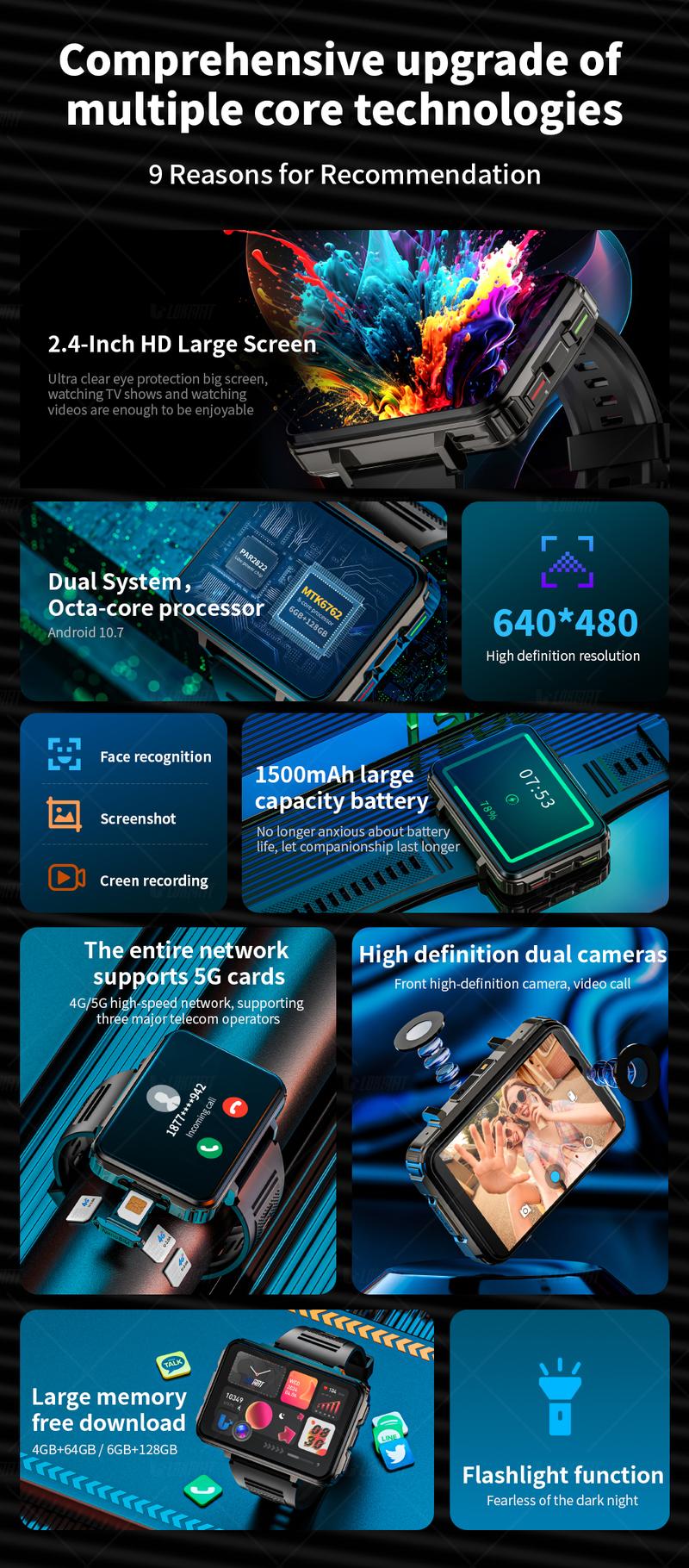 LOKMAT 4G SIM Card Android Smart Watch, 2.4" Large Screen Sport Smartwatch 1500mAh Dual Camera WiFi Bluetooth GPS Smart Watches for Men
